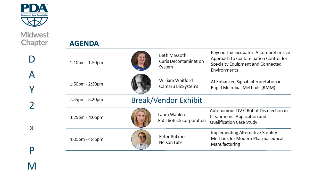Attendees can expect in‑depth sessions covering key topics such as Artificial Intelligence, Environmental Monitoring, Contamination Control Strategies, Root Cause Analysis, and other critical elements of microbial control programs. The program is designed to support practical application, knowledge sharing, and meaningful dialogue among professionals responsible for maintaining robust contamination control and sterility assurance systems.