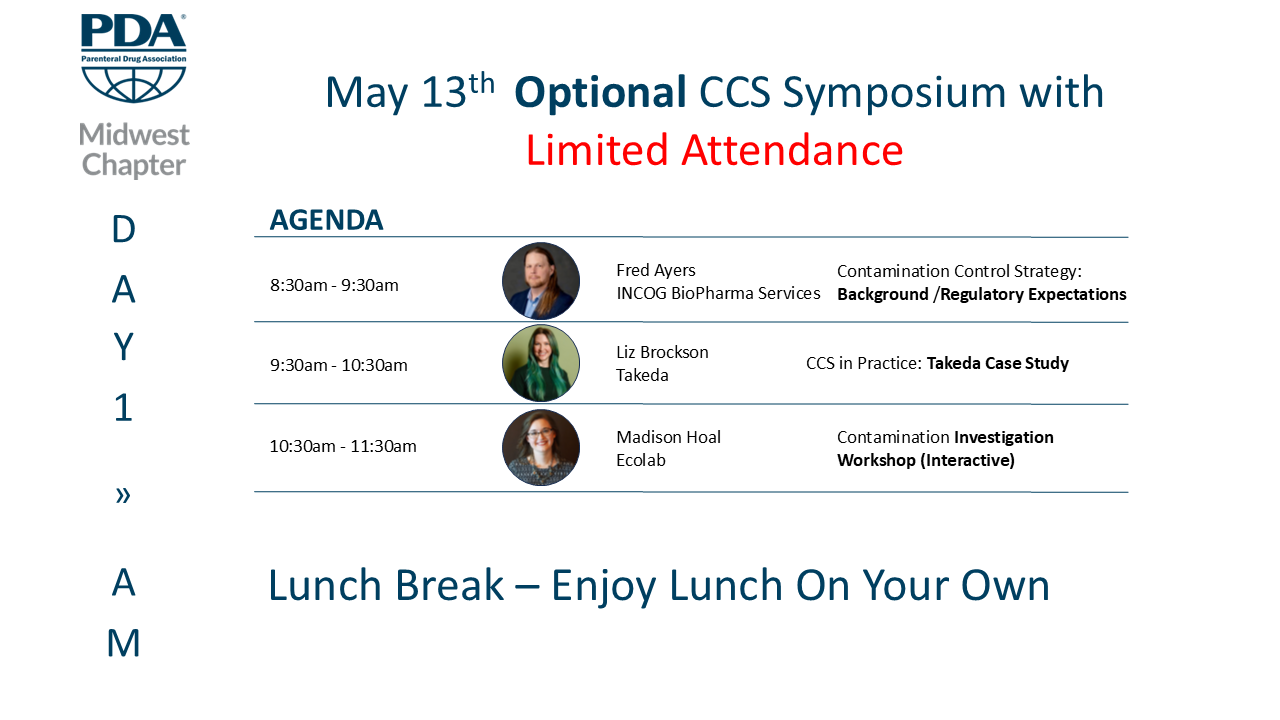 The CCS Symposium is an interactive, hands-on session designed to help participants develop a holistic Contamination Control Strategy (CCS) across the pharmaceutical manufacturing lifecycle. Attendees will gain practical insight into CCS development and implementation, with focused discussions covering critical elements such as facility design and utilities, environmental control, validation and monitoring, quality systems, and the role of people and processes.